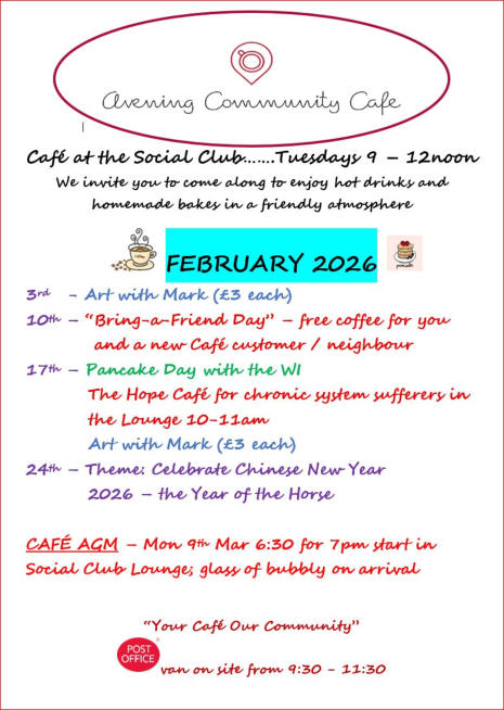 More Info: The Post Office van is parked in the front car park at the club from 9:30 am to 11:30 pm every Tuesday. All Post Office services are available in the van. There are two large rooms at the Club, as well as a kitchen and usual facilities. For café purposes, the skittle alley is used. There is also a lounge/quiet room which is used for special occasions, for example, story time for the very young and live music events. From 9 am till 12:00 noon every Tuesday, coffee, tea, cold drinks are sold, as well as sweet and savoury cakes and biscuits. Special dietary requests can be accommodated. Please ask about this. If you would like to get involved with helping at the café, we are happy to hear from volunteers who would like to join a team or to form their own team to help with serving and looking after customers. We also need cakes and biscuits, so would love to hear from bakers!